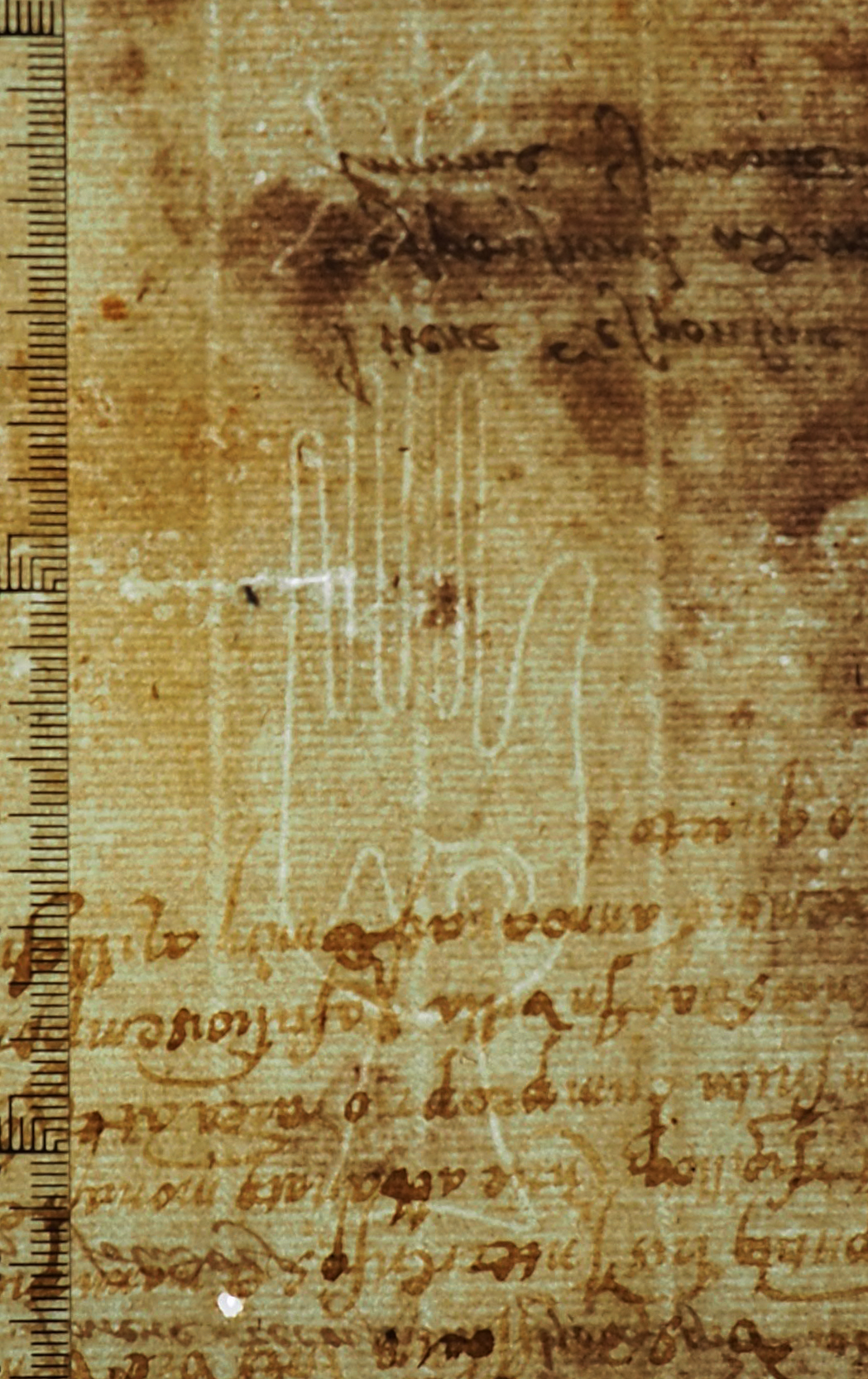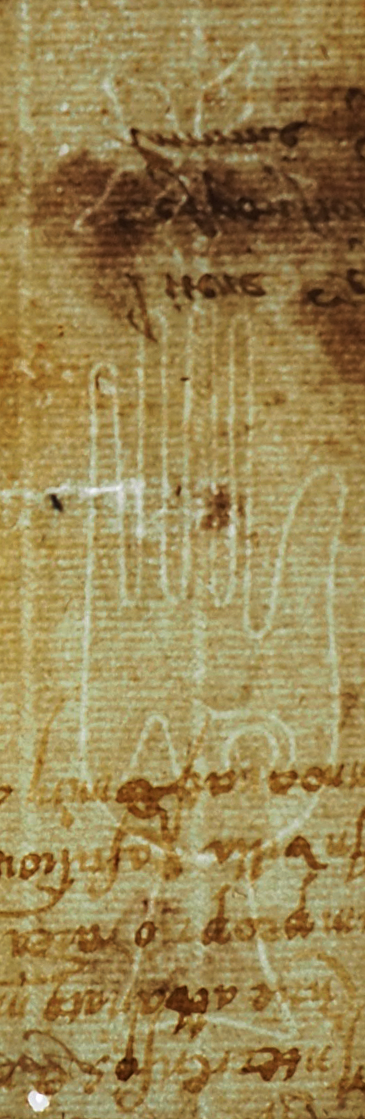 Tipo de filigrana: Sencilla Parte estudiada: Toda la filigrana Código del Motivo: B.01.08.02 Descripción: Mano de grandes dimensiones con los cinco dedos separado. Encima flor de cinco punta. En la palma letras: GA Estructura: Tradicional de líneas Altura (mm): 106 Anchura (mm): 30 Tipo de papel: Verjurado Posición en la hoja: Derecha centro Nº de corondeles en la hoja: 15 Distancia entre corondeles: Situada entre el corondel 10 y el corondel 12 Posición en relación al texto: Perpendicular al texto hacia abajo Origen de los datos: Datos obtenidos del original Autor de los datos de este registro: María Dolores Díaz de Miranda Macías Estado de la hoja: Cortado borde superior Altura de la hoja: [311] Anchura de la hoja: 433 Color de la hoja: Natural Estado de conservación: Malo Institución: Archivo Ducal de Medinaceli -ADM-