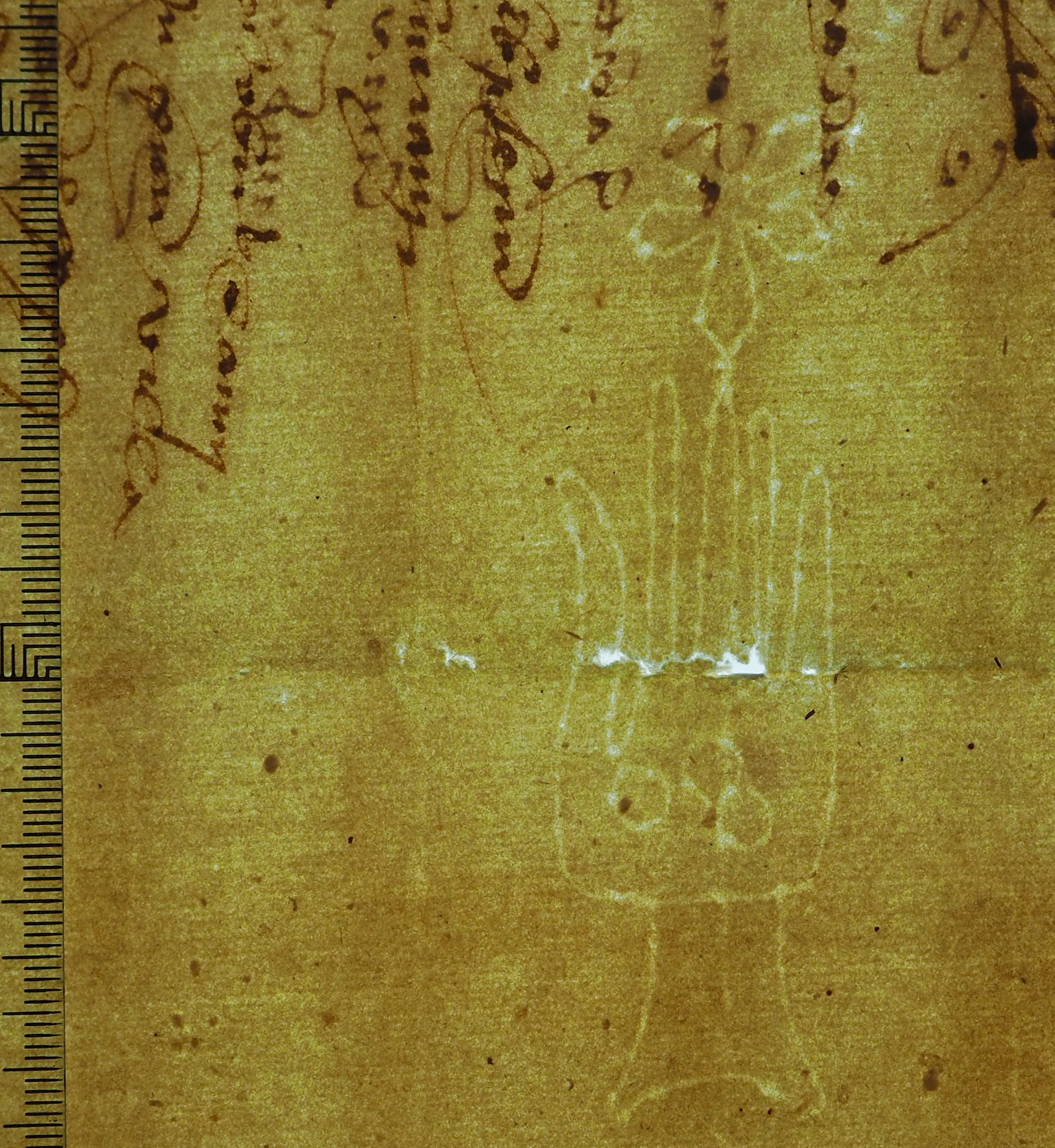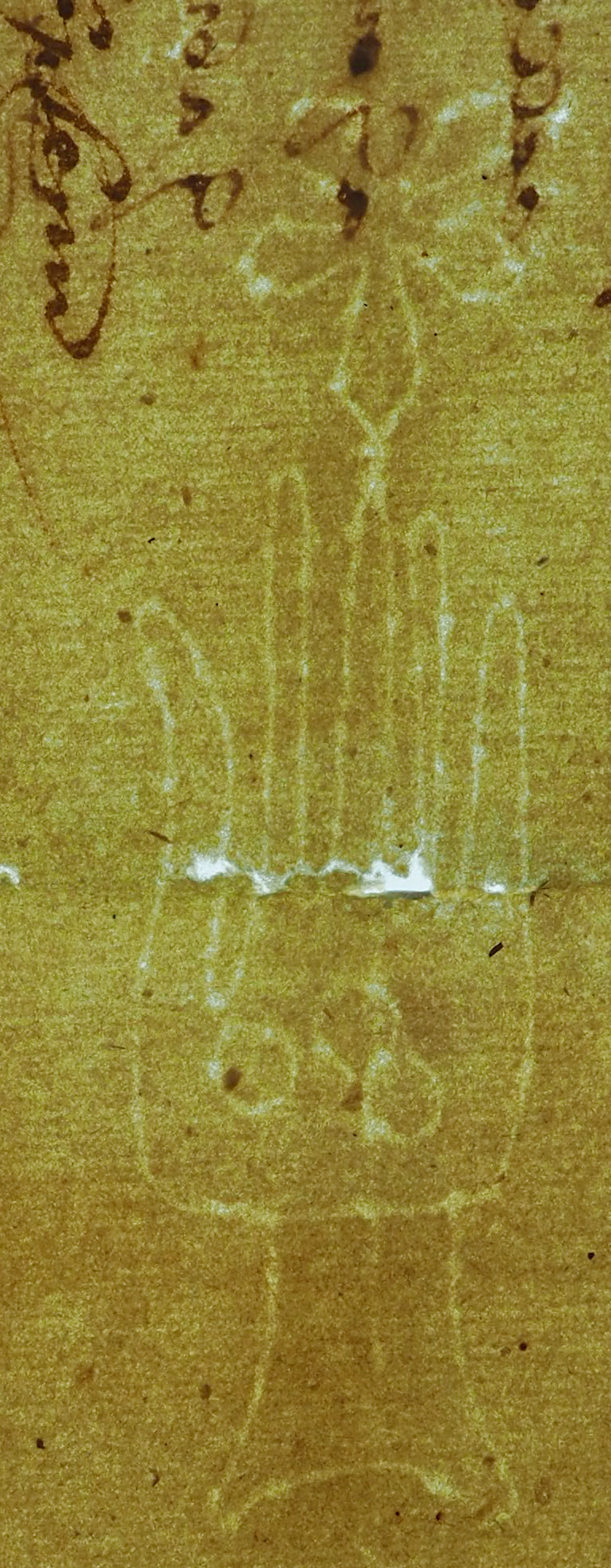 Tipo de filigrana: Sencilla Parte estudiada: Toda la filigrana Código del Motivo: B.01.07.00 Descripción: Mano de grandes dimensiones con los dedos separados. Encima flor de seis puntas. En la palma tres círculos Estructura: Tradicional de líneas Altura (mm): 92 Anchura (mm): 25 Tipo de papel: Verjurado Posición en la hoja: Izquierda centro Nº de corondeles en la hoja: 7 Distancia entre corondeles: Situada entre el corondel 3 y el corondel 5 Posición en relación al texto: Origen de los datos: Datos obtenidos del original Autor de los datos de este registro: María Dolores Díaz de Miranda Macías Estado de la hoja: Cortado borde derecho Altura de la hoja: 306 Anchura de la hoja: 214 Color de la hoja: Natural Estado de conservación: Regular Institución: Archivo Ducal de Medinaceli -ADM-