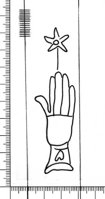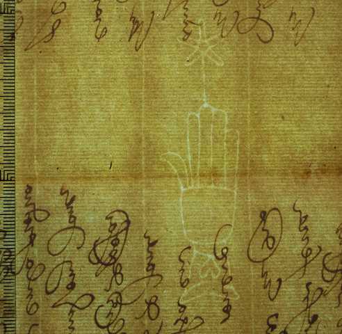 Tipo de filigrana: Sencilla Parte estudiada: Toda la filigrana Código del Motivo: B.05.02.00 Descripción: Mano con dedos separados por una línea en las palmas. Con motivos secundarios Estructura: Tradicional de líneas Altura (mm): 86 Anchura (mm): 24 Tipo de papel: 7 Posición en la hoja: Izquierda centro Distancia entre corondeles: Situada entre el corondel 4 y el corondel 5 Posición en relación al texto: Origen de los datos: Datos obtenidos del original Autor de los datos de este registro: María Dolores Díaz de Miranda Macías Estado de la hoja: Cortados todos los bordes Altura de la hoja: 310 Anchura de la hoja: 217 Color de la hoja: Natural Estado de conservación: Bueno pH del papel: Verjurado Institución: Legajo 23, doc. 3709