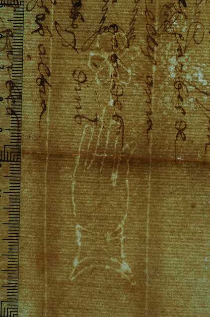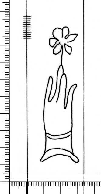 Tipo de filigrana: Sencilla Parte estudiada: Toda la filigrana Código del Motivo: B.02.02.03 Descripción: Mano con cuatro dedos juntos y el pulgar separado. Encima flor de seis puntas Estructura: Tradicional de líneas Altura (mm): 82 Anchura (mm): 22 Tipo de papel: 8 Posición en la hoja: Izquierda centro Distancia entre corondeles: Situada entre el corondel 3 y el corondel 4 Posición en relación al texto: Origen de los datos: Datos obtenidos del original Información adicional: Filigrama idética a la R-2443 Autor de los datos de este registro: María Dolores Díaz de Miranda Macías Estado de la hoja: Cortado borde derecho e inferior Altura de la hoja: 305 Anchura de la hoja: 216 Color de la hoja: Natural Estado de conservación: Regular pH del papel: Verjurado Institución: Legajo 23, doc. 3693