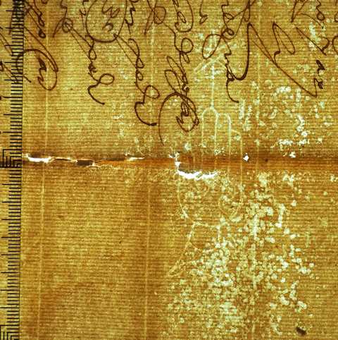 Tipo de filigrana: Sencilla Parte estudiada: Toda la filigrana Código del Motivo: B.02.04.03 Descripción: Mano con cuatro dedos juntos y el pulgar separado. Encima flor de cinco puntas. Dentro letras: SC Estructura: Tradicional de líneas Altura (mm): 75 Anchura (mm): 20 Tipo de papel: 17 Posición en la hoja: Derecha centro Distancia entre corondeles: Situada entre el corondel 12 y el corondel 13 Posición en relación al texto: Origen de los datos: Datos obtenidos del original Autor de los datos de este registro: María Dolores Díaz de Miranda Macías Estado de la hoja: Sin cortar bordes Altura de la hoja: 304 Anchura de la hoja: 426 Color de la hoja: Natural Estado de conservación: Regular pH del papel: Verjurado Institución: Legajo 23, doc. 3692