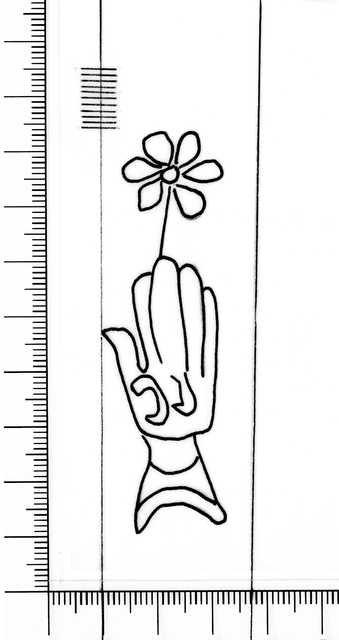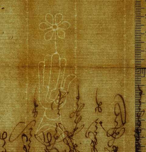 Tipo de filigrana: Sencilla Parte estudiada: Toda la filigrana Código del Motivo: B.02.04.03 Descripción: Mano con cuatro dedos juntos y el pulgar separado. Encima flor de seis puntas. Dentro letras: )) Estructura: Tradicional de líneas Altura (mm): 75 Anchura (mm): 23 Tipo de papel: 16 Posición en la hoja: Derecha centro Distancia entre corondeles: Situada entre el corondel 13 y el corondel 14 Posición en relación al texto: Origen de los datos: Datos obtenidos del original Autor de los datos de este registro: María Dolores Díaz de Miranda Macías Estado de la hoja: Cortados todos los bordes Altura de la hoja: 307 Anchura de la hoja: 433 Color de la hoja: Natural Estado de conservación: Regular pH del papel: Verjurado Institución: Legajo 23, doc. 3697