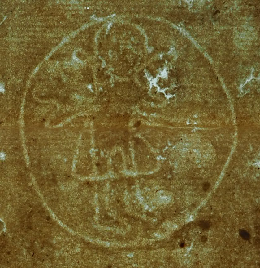 Tipo de filigrana: Sencilla Parte estudiada: Toda la filigrana Código del Motivo: A.01.05.02 Descripción: Peregrino dentro de un círculo. Debajo las letras IR Estructura: Tradicional de líneas Altura (mm): 40 Anchura (mm): 35 Tipo de papel: Verjurado Posición en la hoja: Derecha centro Nº de corondeles en la hoja: 7 Distancia entre corondeles: Situada entre el corondel 3 y el corondel 4 Posición en relación al texto: Origen de los datos: Datos obtenidos del original Estado de la hoja: Cortado borde izquierdo, superior e inferior Altura de la hoja: 305 Anchura de la hoja: 220 Color de la hoja: Natural Estado de conservación: Malo Institución: Archivo Ducal de Medinaceli -ADM-Toledo