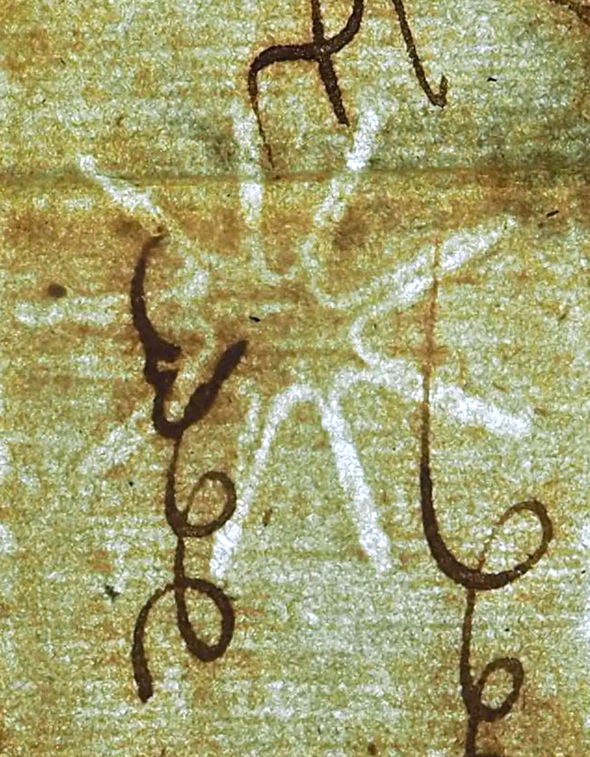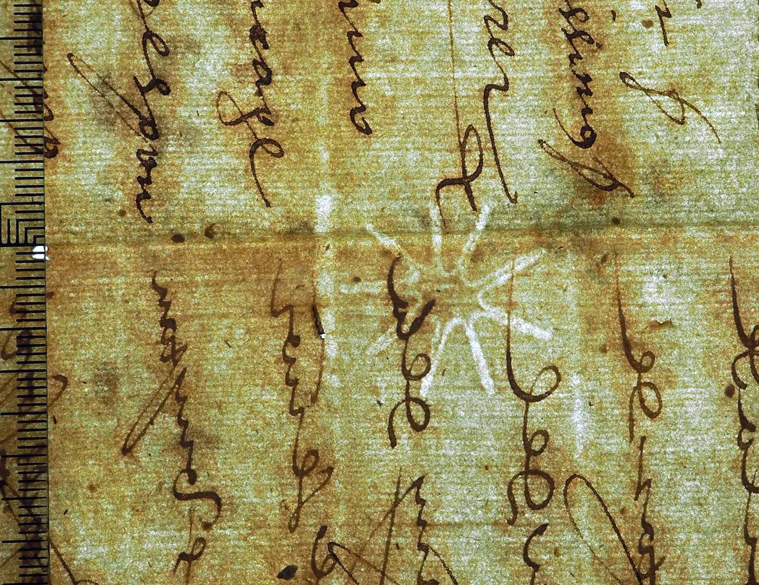 Tipo de filigrana: Sencilla Parte estudiada: Toda la filigrana Código del Motivo: J.03.01.01 Descripción: Esrella de nueve puntas Estructura: Tradicional de líneas Altura (mm): 25 Anchura (mm): 25 Tipo de papel: Verjurado Posición en la hoja: Nº de corondeles en la hoja: 8 Distancia entre corondeles: Situada entre el corondel 4 y el corondel 5 Posición en relación al texto: Perpendicular al texto hacia arriba Origen de los datos: Información adicional: Es una filigrana doble, estudiamos la filigrana izquierda. El pliego original del papel lo formarían las filigranas R-002389 y 002390. El pliego de papel tendría el doble de anchura de la que indica el gráfico Autor de los datos de este registro: María Dolores Díaz de Miranda Macías Estado de la hoja: Cortados todos los bordes Altura de la hoja: 310 Anchura de la hoja: 220 Color de la hoja: Natural Institución: Archivo Ducal de Medinaceli -ADM-Toledo