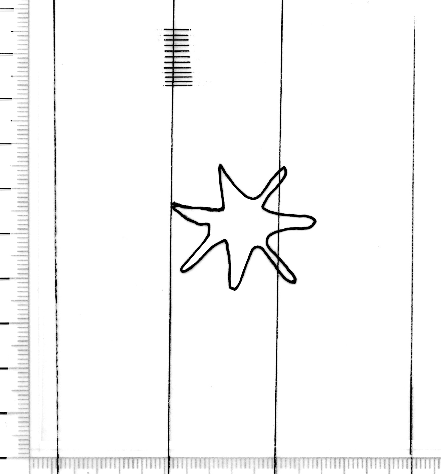 Tipo de filigrana: Sencilla Parte estudiada: Toda la filigrana Código del Motivo: J.03.01.01 Descripción: Esrella de siete puntas Estructura: Tradicional de líneas Altura (mm): 60 Anchura (mm): 34 Tipo de papel: Verjurado Posición en la hoja: Izquierda centro Nº de corondeles en la hoja: 8 Distancia entre corondeles: Situada entre el corondel 2 y el corondel 4 Posición en relación al texto: Perpendicular al texto hacia arriba Origen de los datos: Autor de los datos de este registro: María Dolores Díaz de Miranda Macías Estado de la hoja: Cortado borde derecho Altura de la hoja: 305 Anchura de la hoja: 215 Color de la hoja: Natural Estado de conservación: Regular Institución: Archivo Ducal de Medinaceli -ADM-Toledo
