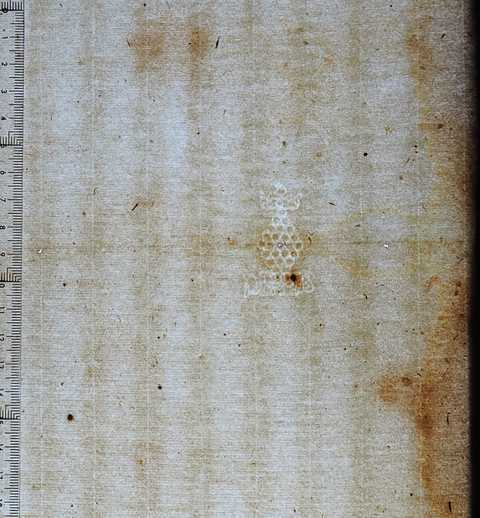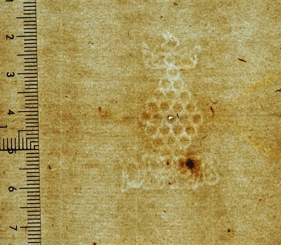 Tipo de filigrana: Sencilla Parte estudiada: Toda la filigrana Código del Motivo: G.04.07.02 Descripción: Racimo de uvas. Encima corona. Debajo letras: PR[A]?S Estructura: Tradicional de líneas Altura (mm): Anchura (mm): Tipo de papel: Verjurado Posición en la hoja: Medio centro Nº de corondeles en la hoja: 12 Distancia entre corondeles: Posición en relación al texto: Origen de los datos: Fabricante: PR[A]?S Estado de la hoja: Cortados todos los bordes Altura de la hoja: 336 Anchura de la hoja: 227 Color de la hoja: Natural Institución: Arxiu Històric de l'Hospital de la Santa Creu i de Sant Pau -AHS