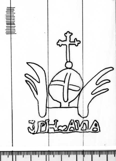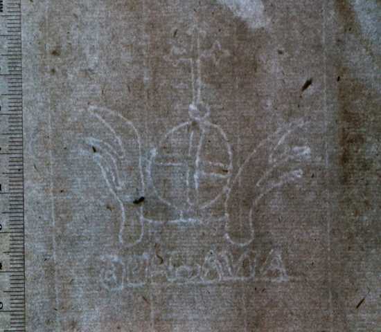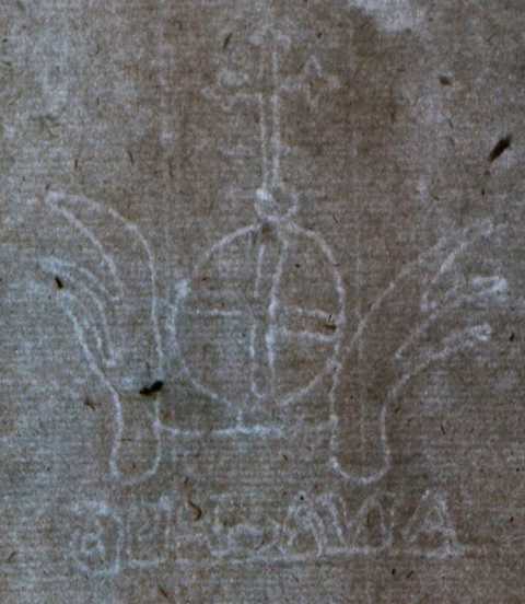 Tipo de filigrana: Sencilla Parte estudiada: Toda la filigrana Código del Motivo: T.04.02.01 Descripción: Escudo de Génova (Esfera con cruz en el centro, encina una pequeño círculo sobre éste cruz lobulada y a cada lado unas alas),. Debajo la letras: JPH (un pequeño corazó) AVIA. Estructura: Tradicional de líneas Altura (mm): 66 Anchura (mm): 57 Tipo de papel: Verjurado Posición en la hoja: Derecha centro Nº de corondeles en la hoja: 14 Distancia entre corondeles: Situada entre el corondel 10 y el corondel 13 Posición en relación al texto: Origen de los datos: Estado de la hoja: Cortados todos los bordes Altura de la hoja: 311 Anchura de la hoja: 333 Color de la hoja: Natural Institución: Archivo y Biblioteca Episcipal de Vic