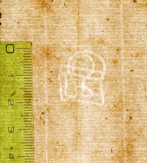 Tipo de filigrana: Sencilla Parte estudiada: Toda la filigrana Código del Motivo: K.05.02.00 Descripción: Campanario Estructura: Tradicional de líneas Altura (mm): 20 Anchura (mm): 16 Tipo de papel: Verjurado Posición en la hoja: Medio centro Nº de corondeles en la hoja: 17 Distancia entre corondeles: Situada entre el corondel 9 y el corondel 10 Posición en relación al texto: Perpendicular al texto hacia arriba Origen de los datos: Datos obtenidos del original Tipo de uso: Papel para escribir Estado de la hoja: Cortados todos los bordes Altura de la hoja: 339 Anchura de la hoja: 448 Color de la hoja: Natural Estado de conservación: Restaurado Institución: Acadèmia de Ciències Mèdiques de Catalunya