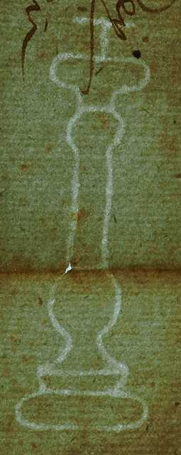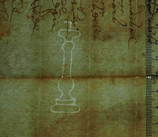 Tipo de filigrana: Sencilla Parte estudiada: Toda la filigrana Código del Motivo: K.03.01.02 Descripción: Columna con una cruz encima Estructura: Tradicional de líneas Altura (mm): 56 Anchura (mm): 18 Tipo de papel: Verjurado Posición en la hoja: Izquierda centro Nº de corondeles en la hoja: 8 Distancia entre corondeles: Situada entre el corondel 3 y el corondel 4 Posición en relación al texto: Origen de los datos: Datos obtenidos del original Estado de la hoja: Cortado borde izquierdo Altura de la hoja: 307 Anchura de la hoja: 216 Color de la hoja: Natural Estado de conservación: Bueno Institución: Archivo Ducal de Medinaceli -ADM-Toledo