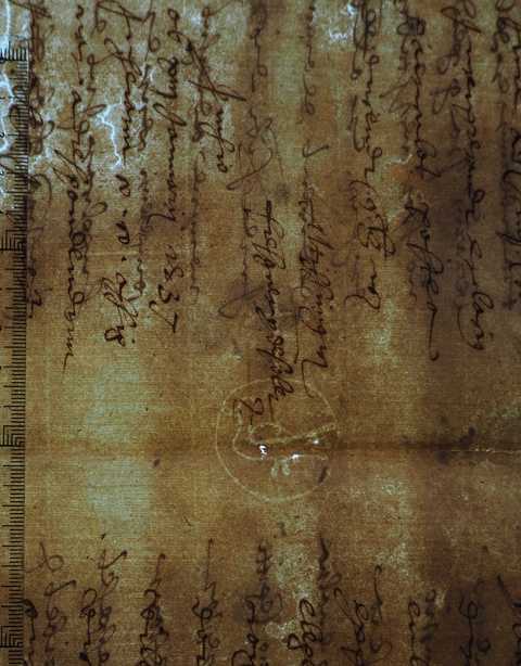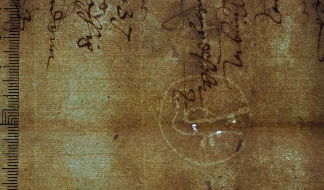 Fondo: Ampurias Signatura: Legajo 24, doc. 3819 País de uso del papel: España Lugar de uso del papel: Comarca del Ampurdán, Gerona, Cataluña Última fecha de uso del papel (año): 1537 Modo de datación: Tomada de la hoja Título/Resumen: Proceso entre Pere Vicens, monje del monasterio de Sant Pere de Rodas como secrestador de los réditos y emolumentos de la pavordia de Fortía, contra Joan Clos y Rafel Vilar, de la villa de Castelló de Ampurias y bailes de los censos y réditos de la mencionada pavordía. | |