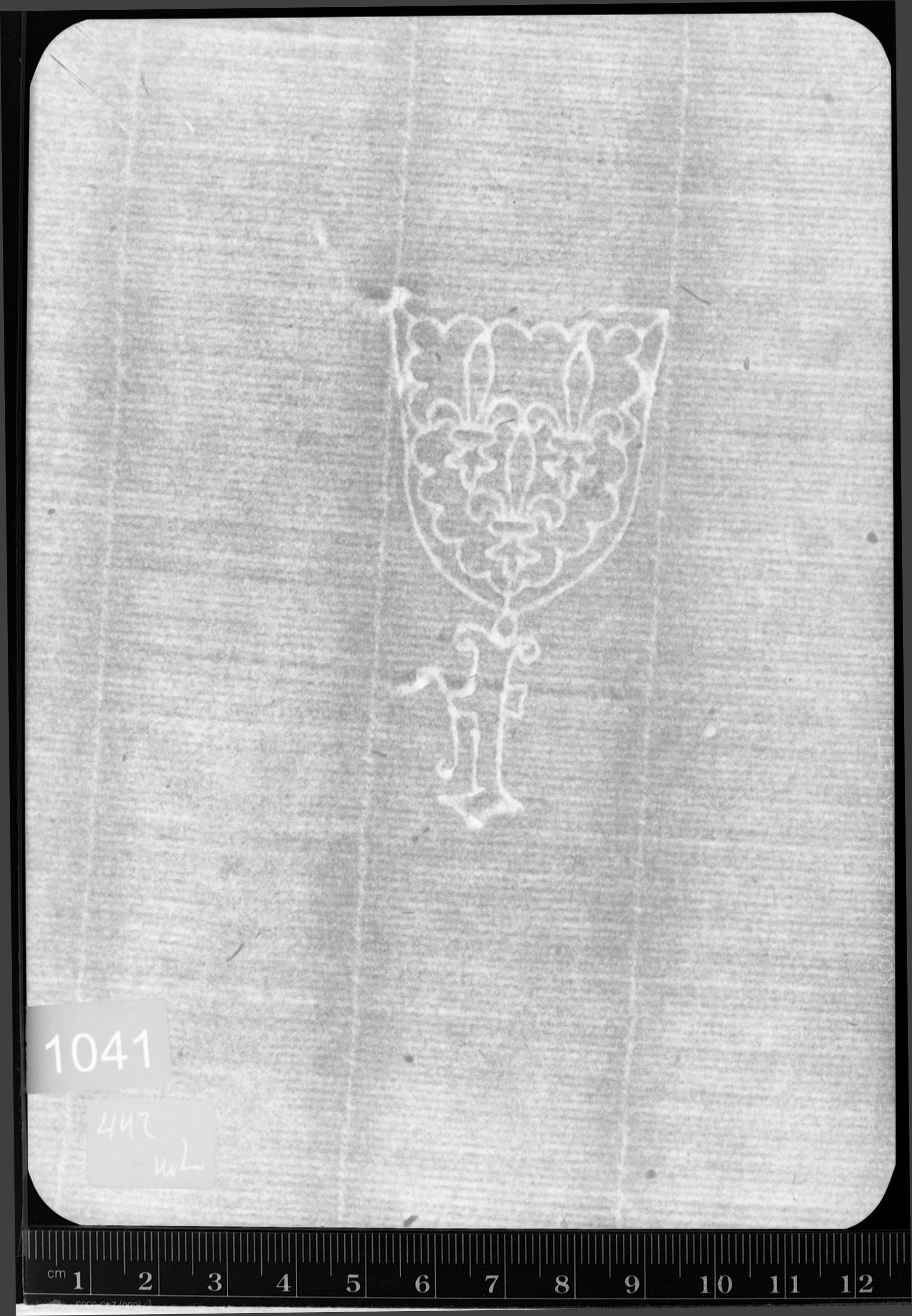 | Reference number: 1041 Watermark description: shield, three lilies, on t to left (France) Bernstein description: coat of arms - national coats of arms - shield - three lilies - on t to left (France) Mainclass IPH: T Maingroup description: shield Position: left Identical watermarks: BMC XI 418: Caxton 60, 63; BMC XI 419: Caxton 73, 74, 75, 76, 77, 78 Reproduction: beta-radiograph Depository: Pierpont Morgan Library, New York, U.S.A. | ![]() ![]() |