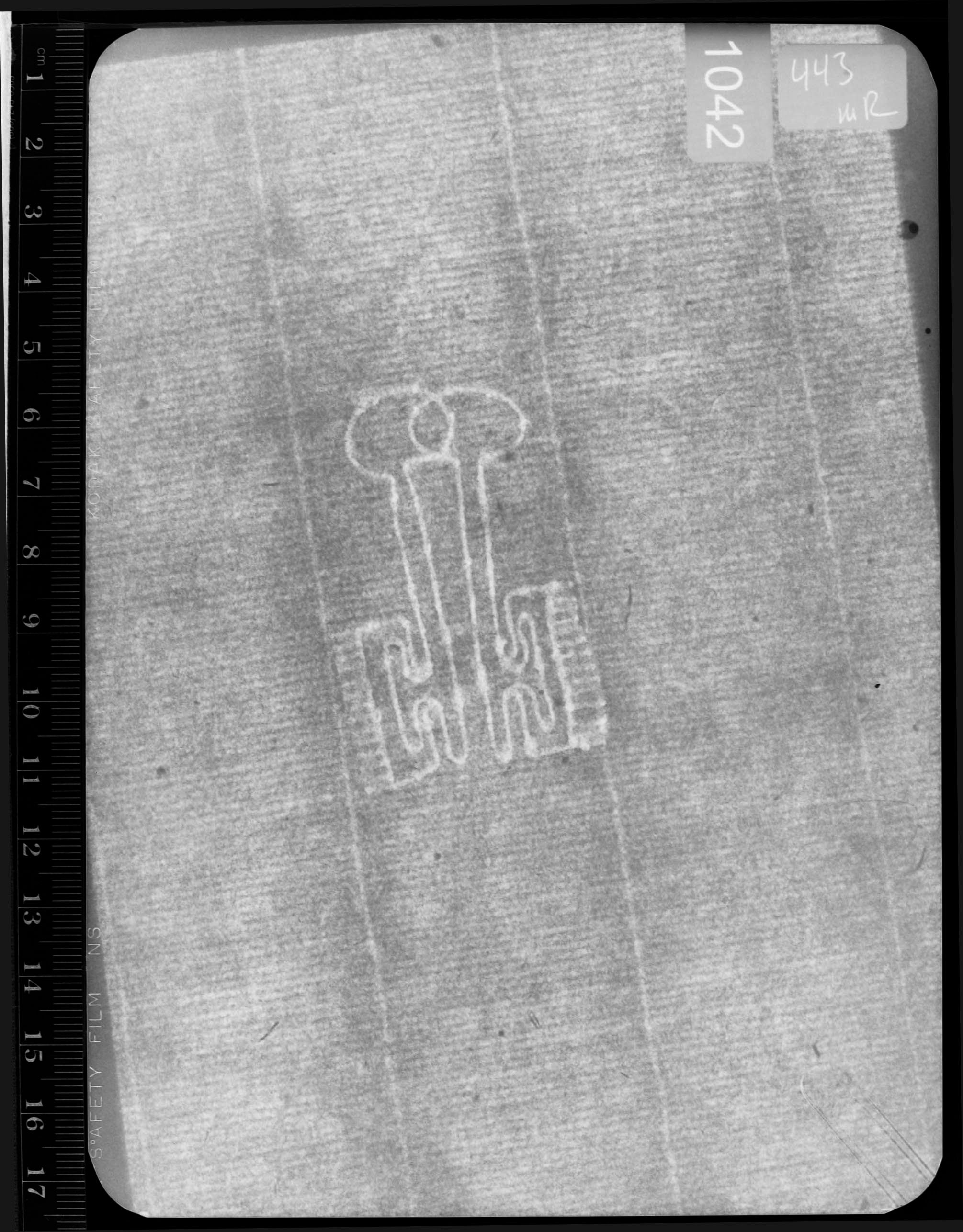 | Reference number: 1042 Watermark description: Keys Bernstein description: realities - key - two keys - detached - rood-tree consisting in two lines - keys Mainclass IPH: N Maingroup description: keys Position: right Identical watermarks: BMC XI 418: Caxton 60, 63; BMC XI 419: Caxton 73, 74, 75, 76, 77, 78 Reproduction: beta-radiograph Depository: Pierpont Morgan Library, New York, U.S.A. | ![]() ![]() |