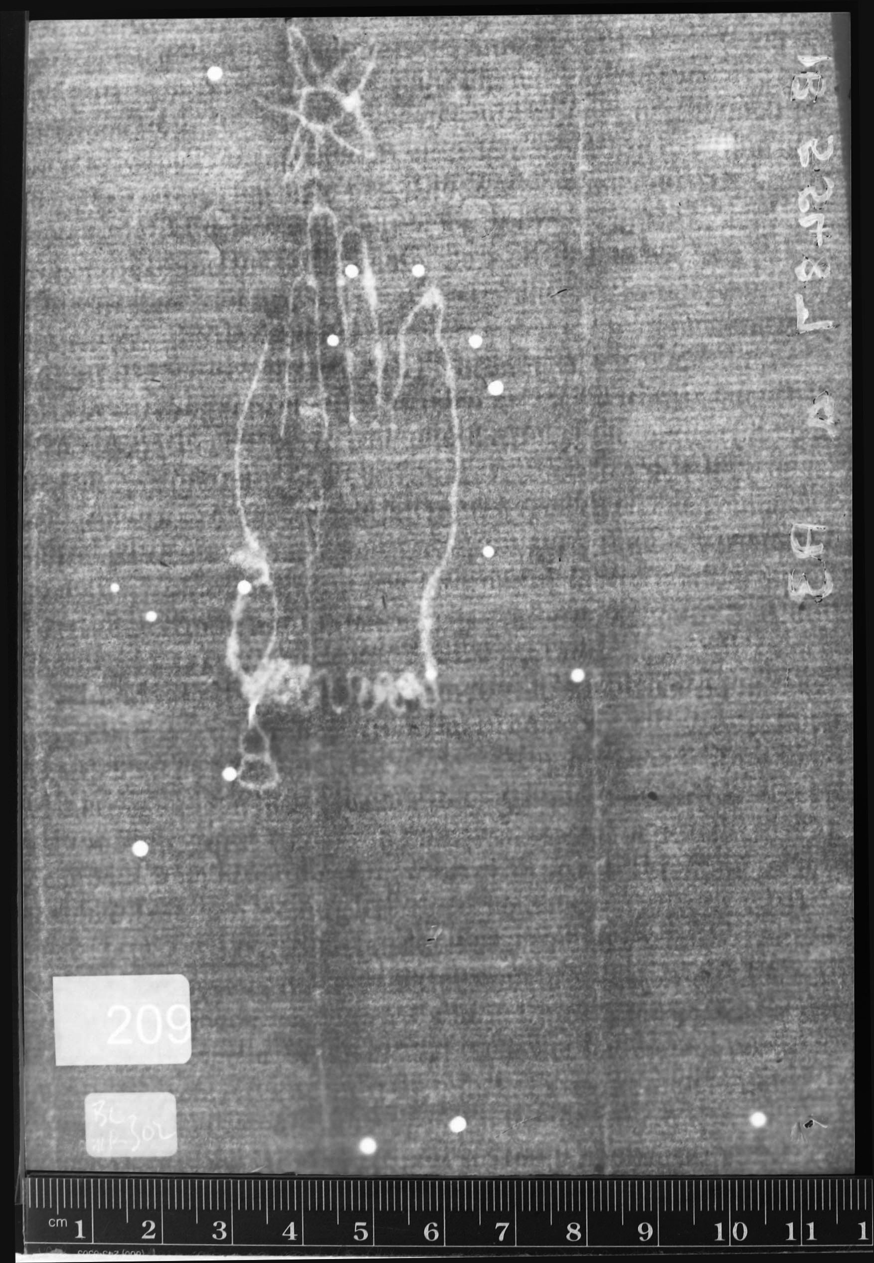 | Reference number: 209 Watermark description: hand, star/flower, five-pointed, letter f, thumb right, III Bernstein description: figures, anthropomorphic - hand/glove - with flower/leaf/star - hand - star/flower - five-pointed - letter f - thumb right - III Mainclass IPH: A Maingroup description: hand Position: right Identical watermarks: Twins: 210 Reproduction: beta-radiograph Depository: British Library, London, Great Britain | ![]() ![]() |