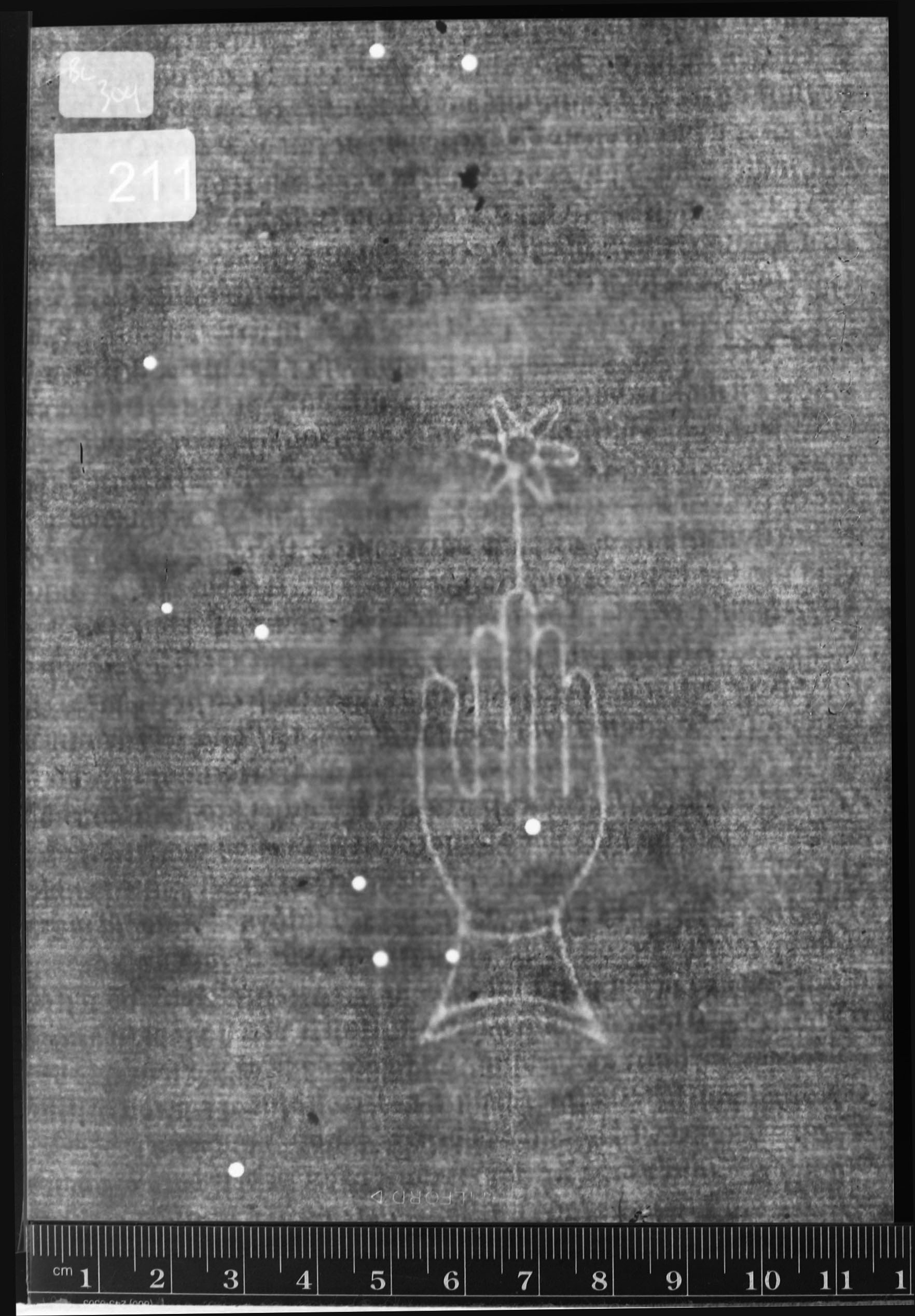 | Reference number: 211 Watermark description: hand, star/flower, six-pointed, 2-2, thumb left, III Bernstein description: figures, anthropomorphic - hand/glove - with flower/leaf/star - hand - star/flower - six-pointed - 2-2 - thumb left - III Mainclass IPH: A Maingroup description: hand Position: right Identical watermarks: Reproduction: beta-radiograph Depository: British Library, London, Great Britain | ![]() ![]() |