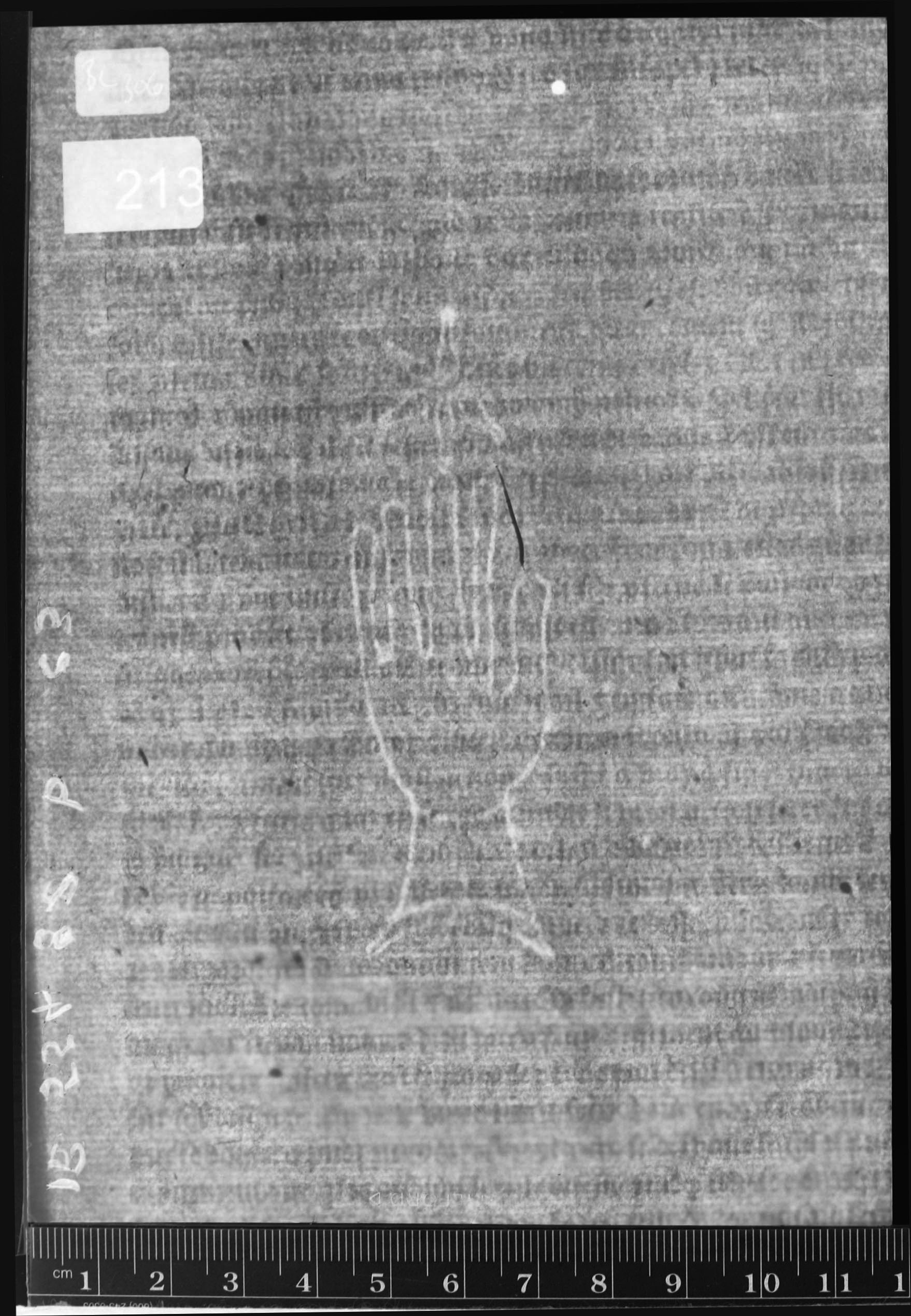 | Reference number: 213 Watermark description: hand, star/flower, six-pointed, 1-2, thumb left, III Bernstein description: figures, anthropomorphic - hand/glove - with flower/leaf/star - hand - star/flower - six-pointed - 1-2 - thumb left - III Mainclass IPH: A Maingroup description: hand Position: left Identical watermarks: Twins: 214 Reproduction: beta-radiograph Depository: British Library, London, Great Britain | ![]() ![]() |