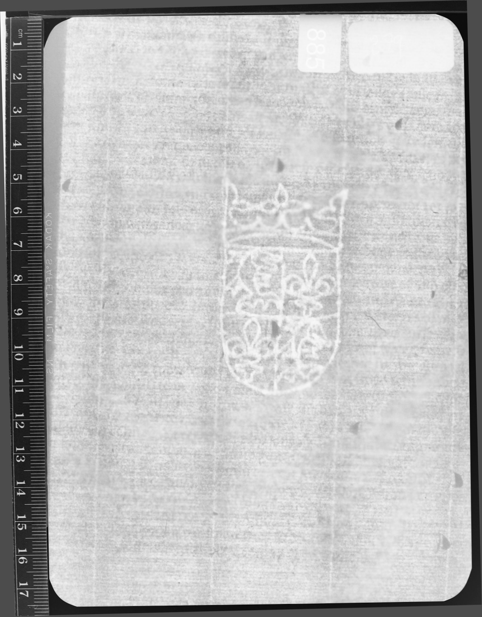 | Reference number: 885 Watermark description: shield, two dolphins, two lilies, crown (Dauphin) Bernstein description: coat of arms - family crest - shield - two dolphins - two lilies - crown (Dauphin) Mainclass IPH: T Maingroup description: shield Position: left Identical watermarks: BMC XI 418: Caxton 60, 61, 62, 65, 66; BMC XI 419: Caxton 67, 68, 69, 70, 71, 72 Reproduction: beta-radiograph Depository: Pierpont Morgan Library, New York, U.S.A. | ![]() ![]() |